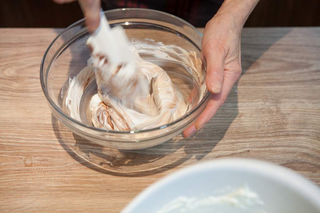 Krem sir mutiti mikserom oko 1 minut, dodati sok od limuna, slatku pavlaku i šećer. Još malo mutiti.