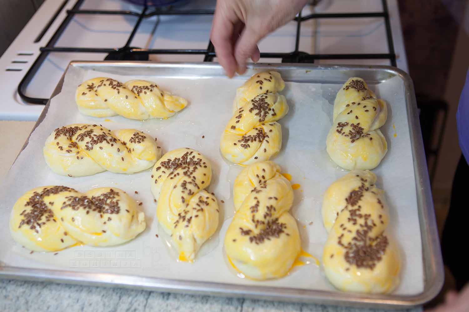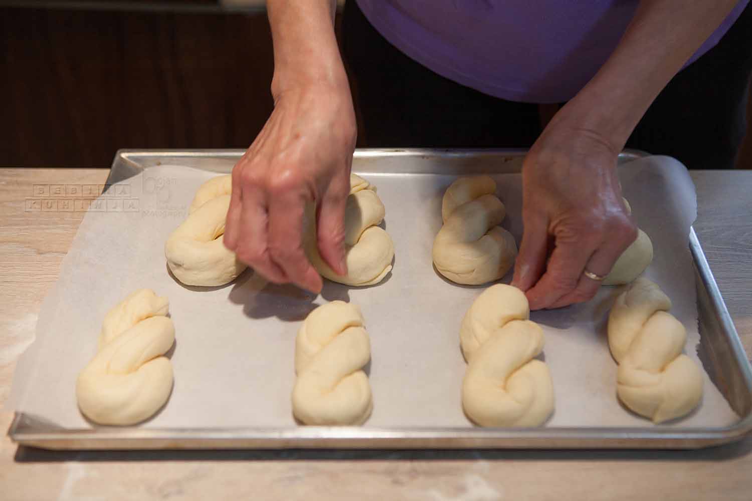 U tepsiju staviti papir za pečenje, premazati uljem i stavljati pletenice. Izmešati žumance sa 1 kašikom mleka i premazati pletenice.