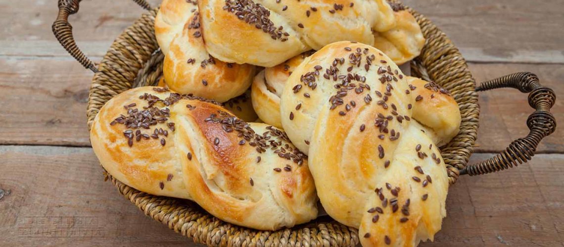 Radnu površinu posuti brašnom, premesiti testo i iseći na 8 komada. U sredinu testa staviti malo proprženog luka, uviti u rolnicu i uplesti.