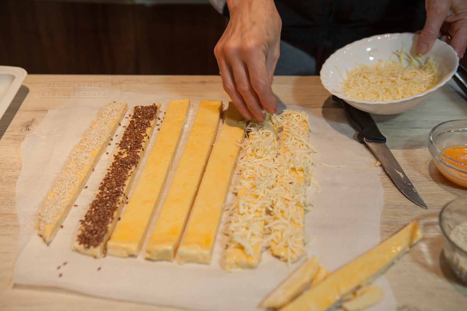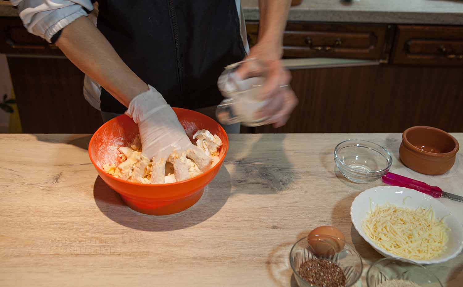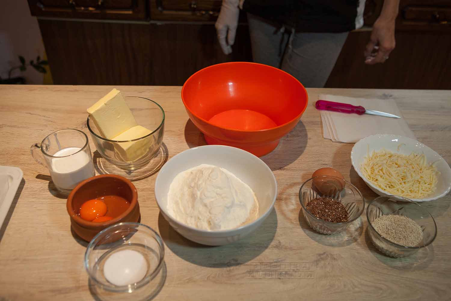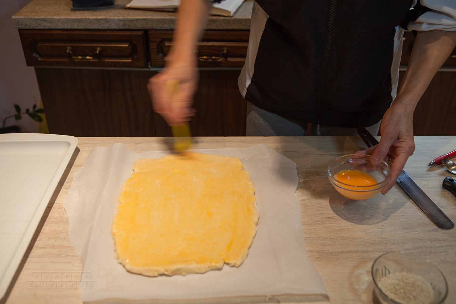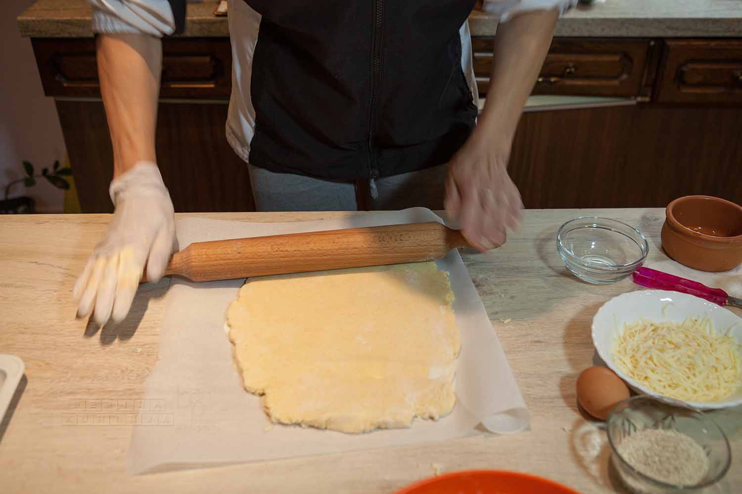 Testo će biti tvrdo, tako treba. Čim se spoje sastojci prestati sa mešanjem da se testo ne premesi. Testo rastanjiti na dasci i premestiti na tacnu.