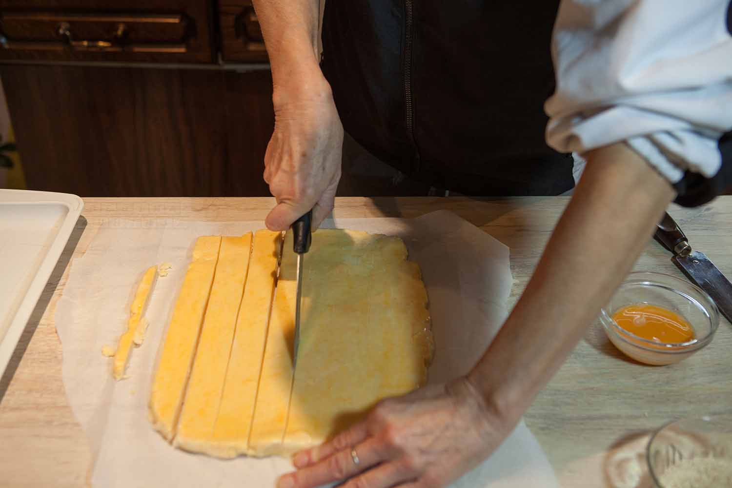 Staviti testo u zamrzivač na 30tak minuta. Izvaditi, sačekati da testo opusti toliko da se može iseći oštrim nožem.